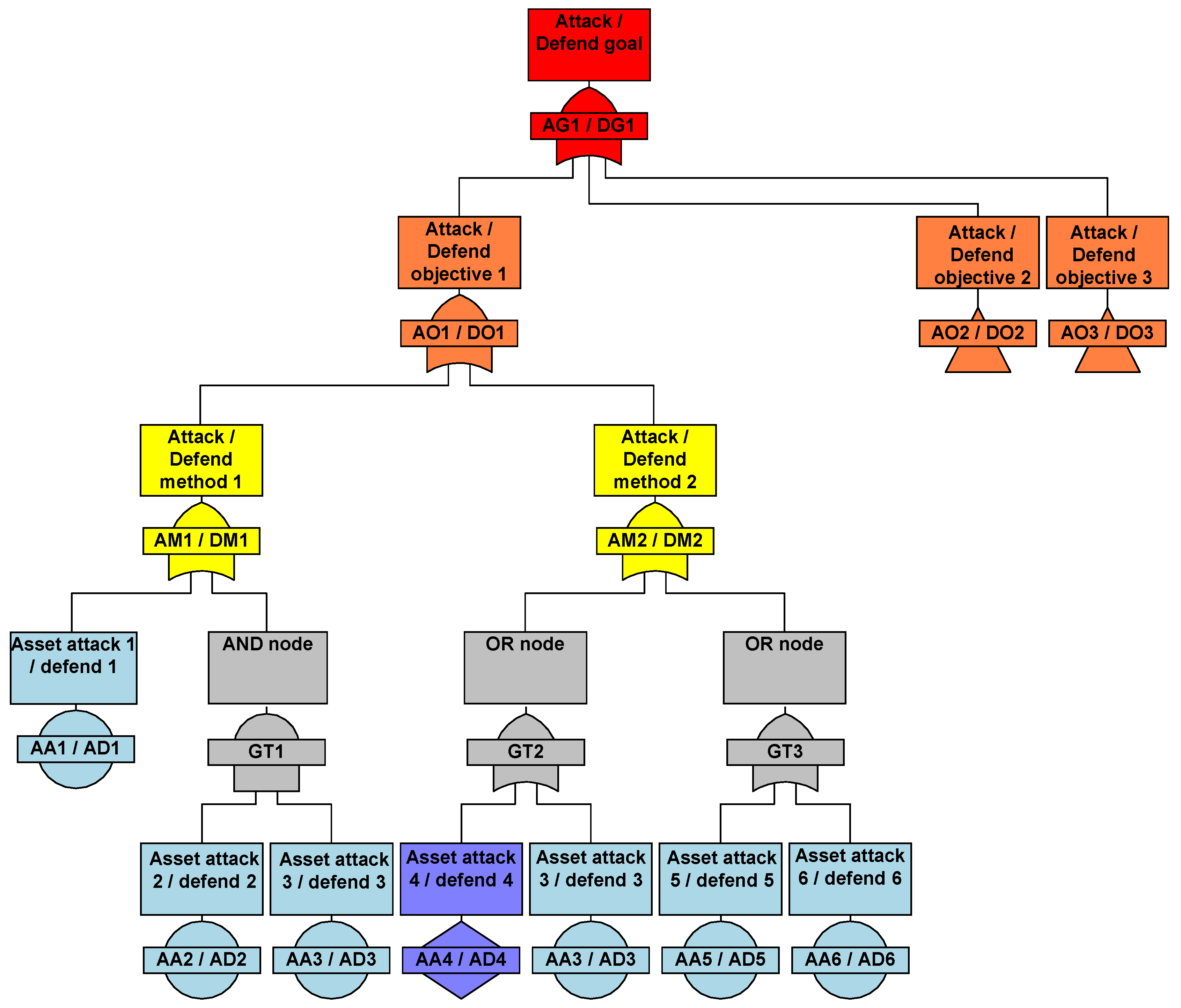 - AG/DG (attack/defense goal): The root of the tree represents the ultimate goal of the attacker or objective to be defended.