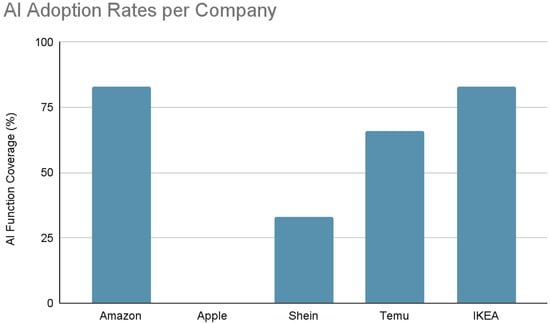 This functional mapping highlights the differing levels of technological maturity and business priorities that influence AI adoption [34,35,36,37,38,39]. Amazon stands out as the most comprehensive user of AI, integrating intelligent systems across the entire value chain. Shein and Temu focus primarily on customer engagement, dynamic marketing, and agile logistics [40]. IKEA’s approach reflects a balance between back-end optimization and basic personalization, while Apple maintains a more indirect and ecosystem-oriented use of AI [41]. These variations reinforce the strategic role of AI as a modular and scalable toolset, tailored to the business models and market positioning of each company [42,43].