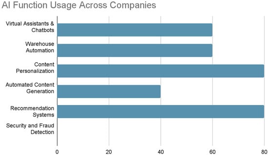 The AI applications were grouped into five main categories: (1) Recommendation Systems, (2) Personalized Content and Marketing, (3) Virtual Assistants and Chatbots, (4) Supply Chain and Warehouse Automation, and (5) Security and Fraud Detection [1,3,8,9,10]. Each company’s implementation of AI was assessed in these categories, based on publicly available descriptions, internal search findings, and the academic literature.