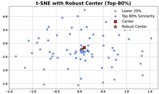 t-SNE visualization of embeddings. The red X denotes the overall mean center, while the orange star represents the robust center calculated from the top 80% most similar embeddings. Embeddings in the top 80% (by cosine similarity to the mean) are shown in blue, and the remaining 20% in gray.