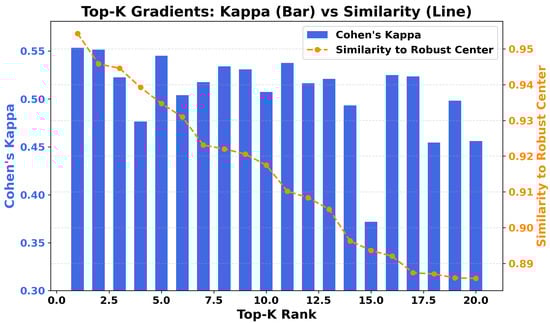 Performance and similarity over Top-K ranked gradients. The bar chart (blue) shows the Cohen’s Kappa achieved by each gradient when used individually. The orange dashed line represents the cosine similarity between each gradient and the robust center. While the most similar often yields the highest Kappa, there are notable cases where the best-performing gradient is ranked lower, indicating that proximity to the center is a probabilistic—rather than absolute—indicator of quality.