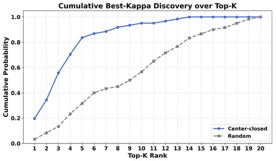 Cumulative distribution of best-performing gradients over Top-K ranks. The blue line (Center-closed) represents the probability of discovering the highest Kappa score within the top-K candidates when gradients are sorted by similarity to the robust center. The gray dashed line (Random) shows the same metric under random ordering. The probability-based view highlights that even when the top 1 fails to capture the optimal gradient, our method substantially increases the likelihood of finding it within a small K compared to a random selection.