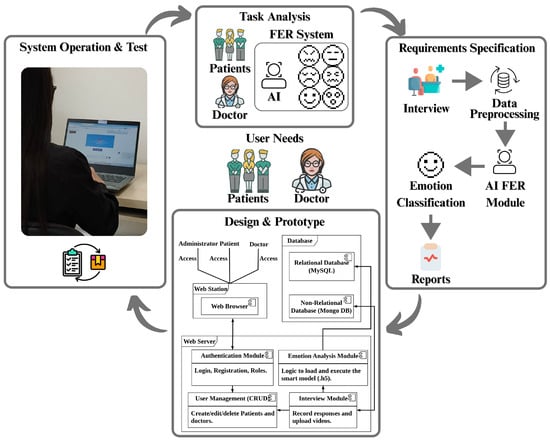 Patient monitoring, through ambulatory assessment, experience sampling, and real-time data capture (EMA), includes a range of methods to evaluate patient behaviour within their natural environments []. These techniques allow integration with other clinical measures, providing medical professionals with a richer, context-aware understanding of the patient’s condition over time. Given that emotional states fluctuate and directly influence mental health severity, Experience Sampling Methods (ESMs) and related outpatient monitoring approaches enable the continuous tracking of emotional patterns contributing to a dynamic and comprehensive picture of the patient’s mental state. ESMs facilitate structured, in situ self-reporting, often through daily or random entries, capturing both affective and contextual data [] using tools such as self-report questionnaires or electronic diaries. An emerging alternative is Facial Emotion Recognition (FER), which enables the real-time capture and analysis of facial expressions, providing objective and continuous emotional assessment []. Based on Ekman’s discrete model of emotion, six basic emotions—anger, joy, sadness, fear, disgust, and surprise—are universally expressed through facial cues []. Supporting this, Mehrabian’s study found that emotions are communicated 55% through facial expressions, 38% through tone of voice, and only 7% through verbal language []. We adopt an applied, mixed-methods approach that combines descriptive research to analyse user needs, technical requirements, and clinical considerations; developmental research to design and implement a functional prototype integrating an intelligent Facial Expression Recognition (FER) module within a secure cloud platform; and experimental evaluation to assess functional suitability, performance, usability, and security following international standards. The proposed system leverages information and communication technologies to enable remote patient monitoring through web-based data acquisition and a scalable cloud infrastructure. It records patient interactions and incorporates an intelligent classification module based on image and video analysis to assess and classify patients’ emotional states automatically. The development process involves defining the operating model, identifying essential modules, components, and functionalities, designing the system architecture, implementing and integrating the intelligent FER model, and performing comprehensive validation tests on the integrated solution.