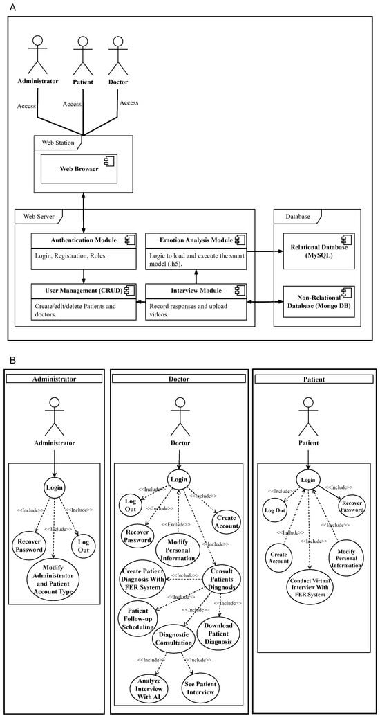 Figure 2. Physical deployment and use case diagrams. - Implementation of the information system: The design and implementation of the information system follow the Software Development Life Cycle (SDLC), which, as described by the authors in [], defines the phases and activities required to develop a software application from conception through implementation and support. In this study, the process comprises the following steps: requirements identification, high-level system architecture design, low-level system design, software coding, functional testing, and performance evaluation of the solution.We define the system requirements based on the elements that shaped the operating model, including its modular components aligned with the planned interactions for each user profile. The use case diagram in Part B of Figure 2 illustrates how the different actors within the cloud system, EmotiCloud, interact with it and the actions they can perform. Upon authentication through the web application front end, patients can access remote scheduled follow-up and complete a virtual interview, responding to mood-related questions presented through a chat interface. Also, the doctor-user, once authenticated, can access their patients’ records, scheduled follow-up sessions, review interviews, and examine the preliminary diagnosis generated by the intelligent module after requesting its analysis. Based on their clinical expertise, the doctor can then establish a definitive diagnosis and download a report containing the patient’s diagnostic information.In addition, we consider the MVC model for the architecture design because it provides a solid and scalable structure, separating the application into three layers: data, logic, and presentation []. The defined layers are the following: