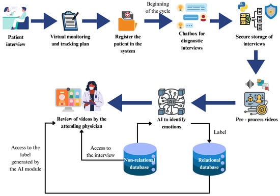 Figure 3 illustrates the system’s operating model. The process begins with an interview between the patient and the treating physician, who, based on the patient’s health status, defines a virtual follow-up plan. The patient registers a user account, which the system administrator activates, granting access to the interview interface via a chatbox. This interface prompts the patient with questions regarding their mood and recent activities while securely storing the associated video and audio recordings in a database. Intelligent models process these recordings to detect the patient’s emotions and generate corresponding labels. These labels are made available to the treating physician during scheduled follow-ups, enabling timely and informed decisions regarding the patient’s treatment.