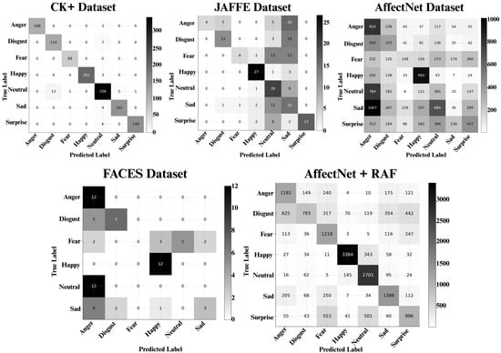 Although CK+ includes spontaneous expressions, we evaluated the resulting model with other databases available to verify generalisation, including Japanese Female Facial Expression (JAFFE) [], FACES [], and AffectNet. According to authors in [,], there is concern regarding the fairness of intelligent models, as they are trained on databases corresponding to a specific population, which may introduce biases related to phenotypic and gender subgroups. Due to the results, we decided to train the model with a mixed database composed of Affetnet and RAF-DB datasets.