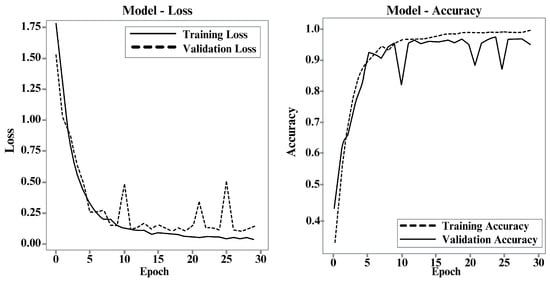 We implement a convolutional neural network (CNN) model designed in Keras that processes (640,490,1) grayscale images. It starts with a convolutional layer of 64 filters of size 3 × 3 filters that allows the extraction of high-level features, followed by a batch normalisation that decreases covariance shifts and speeds up learning, and then a ReLU activation layer that provides sparsity to the data, improving the generalisation of the network, and then a 2 × 2 max pooling layer is included to extract core features and reduce redundancy and a 20% dropout layer that helps prevent overtraining. This pattern is then repeated with a second layer of 128 filters of size 5 × 5 filters, a third layer of 512 filters of size 3 × 3 filters, and a fourth layer of 512 filters of size 3 × 3 filters, all followed by batch normalisation, ReLU activation, Max Pooling, and 20% dropout. After these convolutional layers, two fully connected layers are added: one with 256 neurons and one with 512, with ReLU activation and dropout of 25% and 20%, respectively. The output layer is fully connected with seven neurons and softmax activation for seven-class classification. We compile the model using the Adam optimiser with a learning rate 0.0001 and the categorical cross-entropy loss function. The evaluation metric is accuracy.