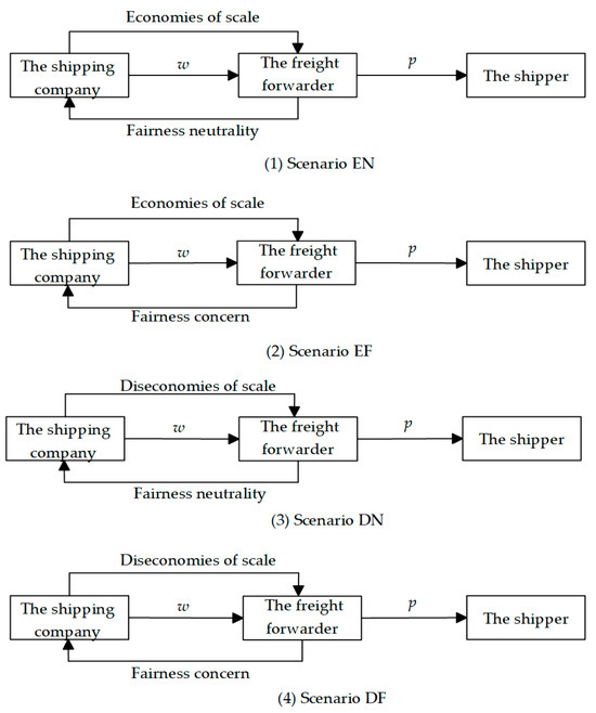 To study the above problems, we establish a two-echelon shipping supply chain consisting of a shipping company and a freight forwarder. In this study, we assume that the shipping company plays a dominant role as the leading player, while the freight forwarder follows and subsequently determines the total freight offered to the shipper. Based on the non-linear production costs of the shipping company and the fairness concern of the freight forwarder, this paper constructs four models: (1) Scenario EN, where there are economies of scale for the shipping company and fairness neutrality for the freight forwarder. (2) Scenario EF, where there are economies of scale for the shipping company and fairness concern for the freight forwarder. (3) Scenario DN, where there are diseconomies of scale for the shipping company and fairness neutrality for the freight forwarder. (4) Scenario DF, where there are diseconomies of scale for the shipping company and fairness concern for the freight forwarder.
