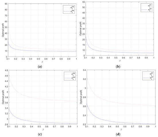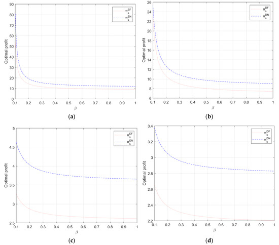 In Corollary 3(b), when economies of scale are relatively low and the cost of the blockchain is also relatively low, the profit of the freight forwarder is inversely proportional to fairness concern. This phenomenon can be attributed to the significantly high input cost associated with the blockchain platform, coupled with its relatively inefficient operations, particularly during the initial investment phase of its development. Additionally, lower economies of scale can provide even smaller economic benefits to the firm. As the degree of fairness concern increases, the freight forwarder’s profit margin becomes insufficient to offset the significant expenses incurred. Therefore, the profit of the freight forwarder is inversely proportional to the fairness concern. With relatively low economies of scale and high blockchain cost, freight forwarder profit is proportional to the level of fairness concern. The blockchain platform is currently operating more effectively, allowing the freight forwarder to offer high-quality logistics services, thereby increasing her profit. Furthermore, when economies of scale are relatively high, the profit of the freight forwarder is inversely proportional to fairness concern. Greater economies of scale allow the shipping company to achieve higher profits while lowering his cost burden. However, as a participant in the supply chain, the freight forwarder has experienced a decrease in profit. The freight forwarder shifts from profit maximization to utility maximization as the level of fairness concern increases. Therefore, the profit of the freight forwarder is inversely proportional to the fairness concern.