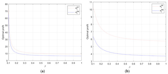 Following Shang et al. [13], we consider that the production costs of the shipping company to be , where denotes diseconomies of scale and denotes economies of scale. Similarly, denotes diseconomies of scale and denotes economies of scale . We use to denote the value of the blockchain platform. For the freight forwarder, we assume that the construction cost of the blockchain platform is , where is the cost factor of building the blockchain platform [31]. The higher results in a higher expense of effort for freight forwarder. The quadratic cost function for the freight forwarder captures the diminishing marginal returns of investments in blockchain technology. Therefore, we employ the quadratic cost function to more accurately measure the investment effects for the freight forwarder. Moreover, this quadratic functional form is widely used in the supply chain and operation management literature [60,63].