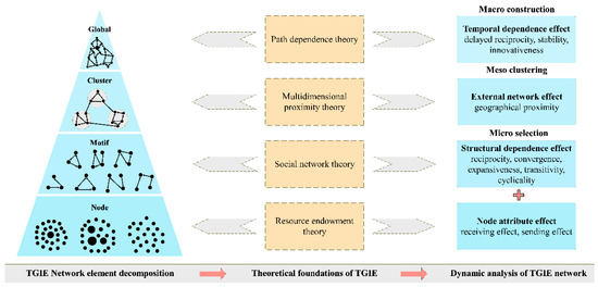 Innovation networks, as the core force driving technological progress and industrial upgrading, have been thoroughly explored in global studies [18]. The formation and evolution of its network show a unique complexity. In the open innovation system, the relationship between various innovation actors in the tourism industry gradually tends to be multilateral and complex, and these interactions are not only the driving force of innovation, but also the key to TGIE enhancement. As pointed out by the theory of resource endowment and multidimensional proximity, the differences in green innovation behaviors among regions are not only closely related to geospatial constraints, but also to the configuration of multidimensional factors such as capital, technology, knowledge, and human resources. Therefore, the evolution of the TGIE network cannot be analyzed purely at the micro-level, but the joint role of exogenous and endogenous factors should be explored from the perspective of spatial and temporal dimensions.