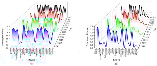 The measured results of China’s TGIE between 2011 and 2023 are shown in Figure 2a. In the first stage, the average value of national TGIE is 0.8072, with an overall fluctuating upward trend. Specifically, it rises from 0.8237 in 2011 to 0.8446 in 2023. Shanghai has been on the efficiency frontier side, with an average value of efficiency as high as 1.2038, while that of Liaoning is only 0.3327, which highlights the significant differences in TGIE between regions. However, the effects of natural environmental factors and random errors are not removed at this stage, and the efficiency measurements have some errors.