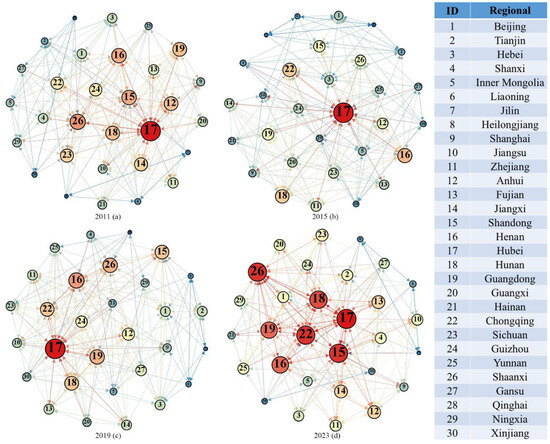 In this paper, the structure of China’s TGIE directed network in 2011, 2015, 2019 and 2023 is measured and plotted according to the gravity model (Figure 3). Among them, the size of the circle represents the size of the node degree value. The degree value includes the degree of connecting in and connecting out.