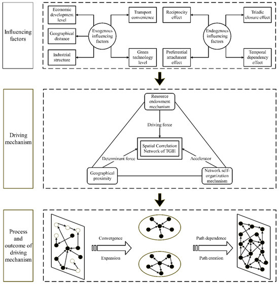 Lusher et al. [23] stated that the exogenous dynamics of the network include node attributes and exogenous contextual factors. Node attributes are categorized as the sender effect, receiver effect, convergence, or divergence between senders and receivers. Exogenous contextual factors include the entrainment effect of other networks and spatial factors. This coincides with the city node attribute effect and inter-city relationship attribute effect, which are concerned with urban innovation networks. In the TGIE network, the region node attribute can correspond to the receiver effect and the sender effect. Regional relational attributes usually refer to the institutional, organizational, cognitive, and geographic proximity between regions. These can correspond to covariate networks such as convergence as well as spatial factors. Thus, exogenous mechanisms of network evolution have been more abundantly tested in traditional regressions [24].