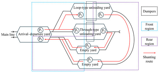 The description above indicates the complexity and diversity of port station operations, where a strong interdependence and coupling exists between various operation plans. Figure 1 illustrates the shunting processes, with red arrows indicating shunting routes. We have observed that shunting operations at the port station are characterized by a significant workload and distributed shunting areas [33]. Each unloading system involves three shunting operations, leading to a total of six types of shunting operations at the station. As a crucial resource, shunting engines must collaborate closely with relevant plans to complete train movement. Therefore, the implementation of an efficient shunting operation mode is crucial for effective operational organization. Considering the distribution of shunting operations at the port station, along with the constraint that shunting engines cannot cross over dumpers, the station can be divided into two operational regions, as shown in Figure 1. According to the division of work areas, the regional operation mode allows shunting engines to operate within specific regions.