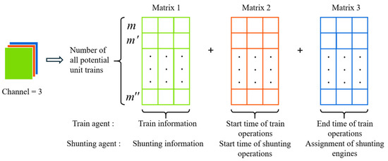Considering the temporal and spatial dimensions of train movements, the local state of each agent is represented by a three-channel matrix, as depicted in Figure 2. This matrix integrates both static and dynamic information, including scheduling attributes such as operational types and times. The changes in the system’s local state and the station’s operational conditions are described from the perspectives of both the train agent and the shunting agent.