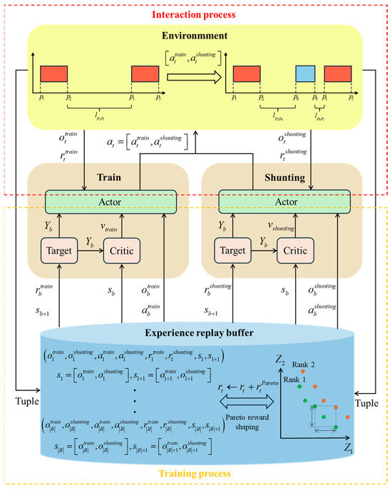 Then, to address the integrated scheduling problem, we transform the model into an MDP and propose an A2C-based dual-agent reinforcement learning framework. The train agent and shunting agent collaborate to form joint actions that interact with the environment, ensuring the synchronized matching of assigned trains and shunting engines. To enhance feature extraction, local states are represented as a three-channel matrix and processed through a convolutional neural network (CNN). The design of the action space is guided by the objective function, and the knowledge-based composite scheduling rules are constructed from a system optimization perspective. Throughout the training process, we adopt a reward shaping mechanism that provides Pareto reward feedback based on global performance to promote collaboration between agents and guide strategy development toward achieving Pareto optimality.