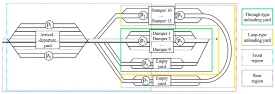 In this paper, we analyze the operational organization of a heavy haul railway port station involved in coal rail–water intermodal transportation in China. The port station is located at the unloading end of the heavy haul railway, generally consisting of an arrival–departure yard and an unloading yard, as illustrated in Figure 1. The arrival yard is mainly responsible for the arrival inspection operation and splitting operation of inbound trains. To better address the practical challenges of port station operations, this paper considers a hybrid unloading system.