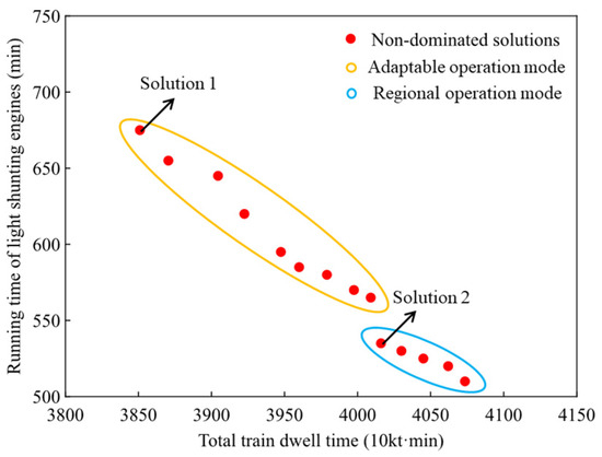 This section analyzes the results of applying the proposed algorithm. Figure 6 shows the Pareto non-dominated set, which is divided into two parts: one corresponding to the adaptable operation mode and the other to the regional operation mode. Comparing the two solution sets, it is evident that the adaptable operation mode minimizes the total train dwell time but increases the running time of light shunting engines due to additional penalties. In contrast, the regional mode results in more stable running routes but increases train dwell time. The widespread distribution of the Pareto front provides decision-makers with flexibility in balancing train dwell time with shunting operation modes.