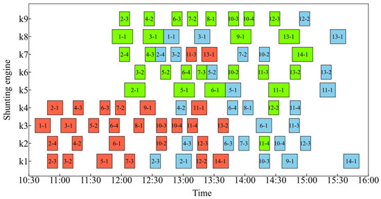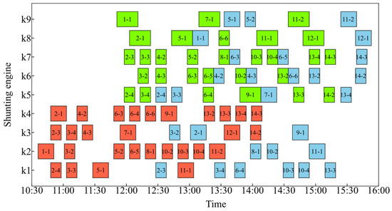 Shunting operation Gantt chart of Solution 1. The red, green, and blue segments represent the first, second, and third shunting operations, respectively.