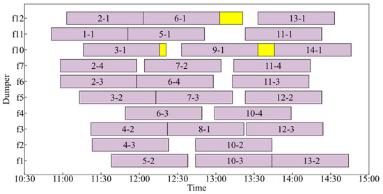 Dumper Gantt chart of Solution 2. The purple segments represent the unloading operations. The yellow segments represent periods when trains that have completed unloading occupy tracks but have not been shunted.