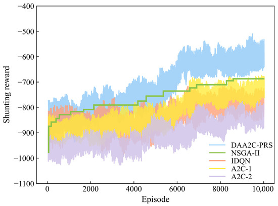 The cumulative reward curves for the train and shunting agents during the training process of five algorithms are depicted in Figure 11 and Figure 12, respectively. First of all, our proposed DAA2C-PRS converges to the optimal solution and maintains stability over time. The fluctuations in the trends of the two reward curves are inevitable during the training process, which reflect the exploration process of optimal strategies. Meanwhile, the incorporation of the reward shaping mechanism in DAA2C-PRS plays a pivotal role in mitigating the risk of agents being trapped in local optima and facilitating a balance between the two objective functions. NSGA-II demonstrates certain optimization capabilities but tends to converge prematurely, failing to explore the solution space thoroughly. Furthermore, the slower ascent of the reward curves for A2C-1 compared with DAA2C-PRS indicates the critical importance of action space design in optimizing scheduling strategies. The tailored action space of DAA2C-PRS enables agents to quickly identify promising strategies, thereby minimizing ineffective exploration and enhancing training efficiency.