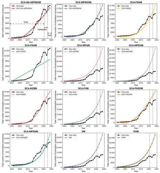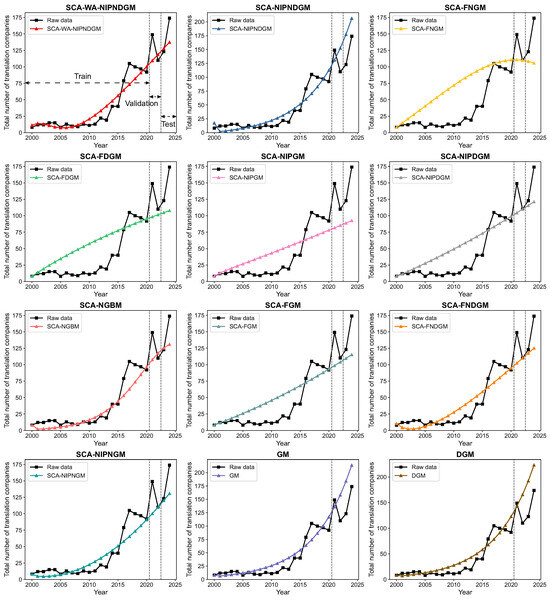 Figure 1 presents the prediction results for the total number of translation companies in China’s manufacturing industry, encompassing both the training and testing phases. The raw data indicates a fluctuating yet generally increasing trend in the number of translation companies, with notable growth observed toward the latter part of the dataset, particularly between 2015 and 2020. This trend aligns with the broader context of China’s manufacturing industry transformation. As China moves up the global value chain, there is an increasing demand for sophisticated international collaboration, technology transfer, and export-oriented services, all of which necessitate specialized translation and localization. Furthermore, the “Made in China 2025” initiative and the “Belt and Road Initiative” have intensified global engagement, fueling the need for comprehensive translation and language services to facilitate cross-border communication, technical documentation, and regulatory compliance. Among the 12 forecasting models applied, the SCA–WA–NIPNDGM demonstrates a superior ability to describe the underlying dynamics within this time series. In the testing phase, the predicted values from the SCA–WA–NIPNDGM are remarkably close to the raw data compared to those from the other models. This indicates its robust generalization capability and higher accuracy in predicting future trends, reflecting its enhanced adaptability to the evolving landscape of China’s industrial services sector.