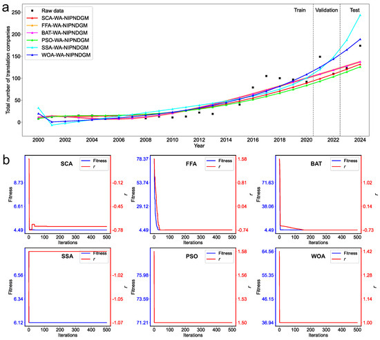 Predicted values and convergence curves of the six algorithms in Case III. (a) Prediction results of the six algorithms compared to the raw data; (b) Convergence curves of the fitness and the hyperparameters for each algorithm.