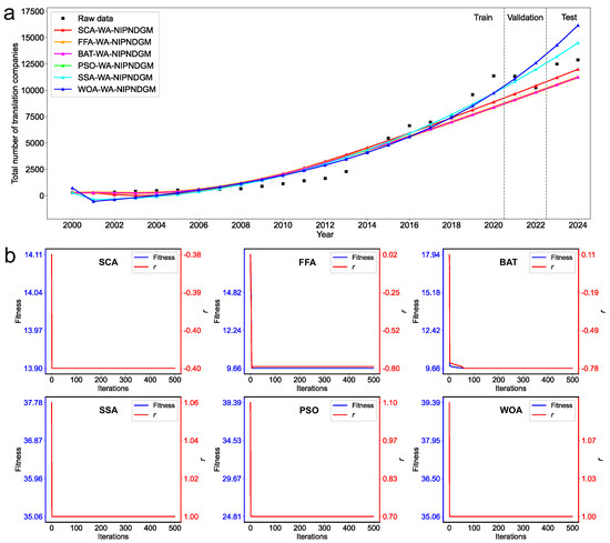 Figure 6 presents the predicted and actual values from 2000 to 2024 across the six hybrid models. Overall, the proposed SCA–WA–NIPNDGM demonstrates a high degree of alignment with the observed data throughout the training (2000–2020), validation (2021–2022), and test (2023–2024) phases. Its forecast trajectory closely follows the trend of the original series, particularly in capturing key inflection points and growth patterns with minimal deviation. In contrast, several alternative models—most notably the PSO–WA–NIPNDGM, SSA–WA–NIPNDGM, and WOA–WA–NIPNDGM—exhibit substantial divergence from the actual data, particularly in the early training years. These models generate negative predictions for certain years (e.g., PSO–WA–NIPNDGM for 2001–2003), which are not physically plausible given the nature of the data, suggesting instability in their estimation under sparse or volatile conditions. Moreover, the trajectories of these models often show abrupt fluctuations or overestimated peaks, especially from 2021 onward. Although the FFA–WA–NIPNDGM and BAT–WA–NIPNDGM produce predictions similar to those of the SCA–WA–NIPNDGM in the mid-to-late periods (2010-2024), they tend to systematically underestimate the values during the earlier part of the series and lag behind in capturing the steep increases observed in the ground truth. By comparison, the SCA–WA–NIPNDGM maintains better consistency across all time segments, with smaller residuals and fewer directional mismatches relative to the observed data curve. As shown in Figure 6b, most optimization algorithms exhibit rapid convergence behavior, reaching stable objective values within a relatively small number of iterations. An exception is observed in the case of the BAT–WA–NIPNDGM, which demonstrates significantly slower convergence. The BAT-based model requires more iterations to stabilize and displays noticeable oscillations during the early stages of the optimization process, indicating reduced convergence efficiency and potential sensitivity to initial parameter settings.