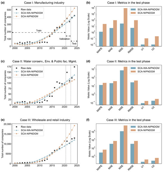 In Case I, focusing on the manufacturing industry (Figure 7a), the SCA–WA–NIPNDGM, utilizing an optimal hyperparameter , more closely tracks the observed number of translation companies, especially in the validation and testing periods, compared to the SCA–NIPNDGM. While both models capture the general upward trend, the wavelet-enhanced model exhibits a smoother and more responsive predicted curve. This qualitative observation is also supported by the test phase metrics (Figure 7b). The SCA–WA–NIPNDGM achieved a remarkably low MAPE of 1.20%, MAE of 4.84, MSE of 25.95, and RMSE of 5.09. In contrast, the SCA–NIPNDGM, using the same SCA-optimized hyperparameter, yielded significantly higher errors in the test phase (MAPE: 22.27%, MAE: 90.97, MSE: 8374.29, RMSE: 91.51). The Theil’s U1 and U2 statistics further underscore this superiority, with values of 0.006 and 0.012 for the SCA–WA–NIPNDGM, compared to 0.101 and 0.224 for the SCA–NIPNDGM, respectively, indicating a substantially better predictive fit for the wavelet-integrated model. A similar pattern of improved performance is observed in Case II, which analyzes the water conservancy, environmental, and public facilities management sector (optimal ). As depicted in Figure 7c, the SCA–WA–NIPNDGM again provides a more accurate representation of the historical data trajectory, particularly in navigating the fluctuations present in the series. The corresponding test-phase metrics (Figure 7d) reveal a clear advantage for the wavelet-denoised model: the MAPE (12.57% vs. 22.35%), MAE (20.81 vs. 36.03), MSE (680.86 vs. 1794.86), and RMSE (26.09 vs. 42.37) values are all substantially lower for the SCA–WA–NIPNDGM. This suggests that the denoising process effectively filters out noise components that otherwise hamper the predictive capability of the standard NIPNDGM. Finally, in Case III, examining the wholesale and retail industry (optimal ), the benefits of wavelet preprocessing are again pronounced (Figure 7e,f). This sector’s data exhibits a more exponential growth pattern, and the SCA–WA–NIPNDGM demonstrates a superior ability to capture this dynamic. In the test phase, the SCA–WA–NIPNDGM achieves an MAPE of 8.65%, while the SCA–NIPNDGM yields an MAPE of 42.27%.
