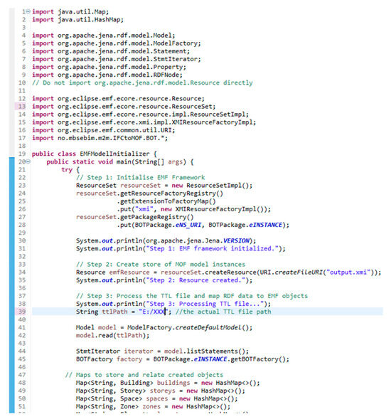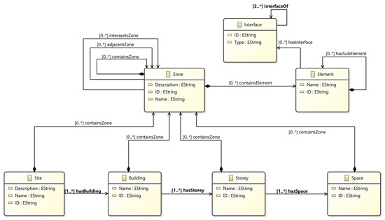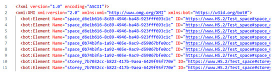 A custom Eclipse-based model-to-model (M2M) converter was then used to parse the .ttl RDF output and generate an XMI file in the structure of the defined XMI-MOF metamodel, mapping the BOT elements to the MOF classes compatible with SysML. The metamodel defined the appropriate classes, attributes, and relationships of the RDF (Figure 7) and aligned them with the XMI-MOF elements.