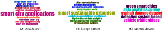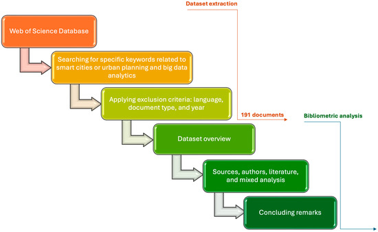 It is important to mention here the rationale behind the keywords’ selection. Instead of using a wide range of terms and unnecessarily increasing the limitations of the dataset, it was preferred to focus on three essential keywords with their lexical variations that capture the central theme of the research. A similar approach was followed in other bibliometric investigations that address topics such as smart cities for urban planning [49] (keywords used: “Smart City”, “Smart Cities”, “Urban Planning”), big data and artificial intelligence in urban planning [50] (keywords: “AI in urban planning”, “big data analytics and urban development”, “smart cities and AI”, “data-driven urban planning”), data mining used for smart cities [51] (keywords: “data mining”, “smart city”, “smart cities”), big data and data mining in smart city construction [52] (keywords: “big data”, “data mining”, “data analysis”, “smart cities”, “intelligent construction”, “automated construction”, “civil engineering”), and crowdsourced data mining for cities [53] (keywords: “crowd*sourc*”, “social media”, “social networks data”, “microblog*”, “POI”, “point*of*interest*”, “VGI”, “location-based”, “LBS”, “LBSM”, “LBSN”, “volunteered geographic information”, “user*generated content”, “geo*tagged”, “geo-big data”, “Twitter”, “tweets”, “Foursquare”, “Flickr”, “geodata”, “check-ins”, “urban”, “city”, “cities”, “space”, “spatial”, “planning”, “spatio-temporal”, “mobility”).