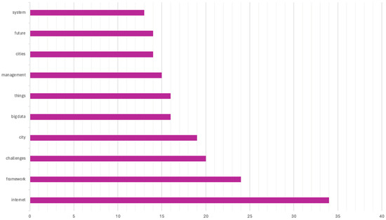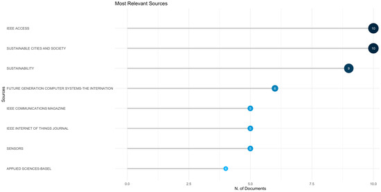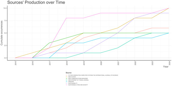 Although the topic experienced a significant growth in the academic community between 2020 and 2022, a small decline was noticed between 2023 and 2024. The initial growth could be attributed to the COVID-19 pandemic, which underscored the necessity of adopting smart solutions for resources’ streamlining. Nevertheless, during the mentioned period, the well-being of cities (e.g., safe means of transportation, a functional and efficient medical system, etc.) became a priority, which offered the academic world the chance to focus on this aspect and conduct various types of research.