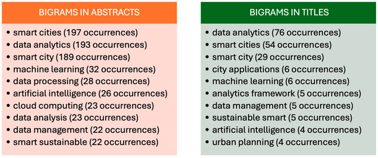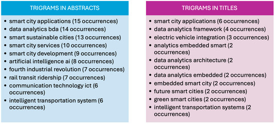 The fourth facet provides a classification of the works according to the number of citations, as well as comprehensive word analysis (e.g., trigrams, bigrams, keywords plus, thematic maps, topic analysis, etc.). To identify the main research topics, Latent Dirichlet Allocation (LDA) has been applied on a combined text corpus consisting of the titles and the abstracts of the analyzed papers. LDA is generative probabilistic model that analyzes word co-occurrence patterns inside a text corpus to identify the main themes. Prior to the modelling process, a text pre-processing step was performed using the Gensim (https://radimrehurek.com/gensim/, 26 June 2025) library [69]. During this pre-processing step, the text has been converted to lowercase, and the punctuation has been removed, together with the generic stop words. Additionally, bigrams and trigrams have been constructed using the CountVectorizer class from the scikit-learn (https://scikit-learn.org/, 26 June 2025) library [70] in order to better capture relevant multiple word expressions.