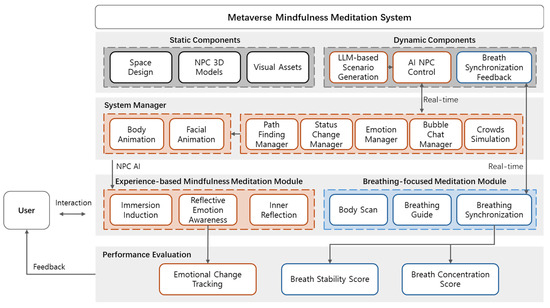 Figure 2 illustrates the overall architecture of the developed metaverse-based mindfulness meditation system, which is composed of static and dynamic components, a system manager, and two main operational modules, along with a performance evaluation. Static components include space design, NPC 3D models, and visual assets, providing the foundational environment and characters for user immersion. The dynamic components enable real-time interactivity and adaptability, including scenario generation powered by LLM, AI NPC control for realistic behavior, and a breathing synchronization feedback system. The functional core consists of two distinct modules: Experience-based Mindfulness and Breathing-focused Meditation. The former emphasizes realistic social engagement and emotional self-awareness through integrated reflective interfaces and interactive scenarios powered by LLM-generated narratives. The latter emphasizes physiological relaxation and breathing control and utilizes synchronized visual feedback and structured breathing protocols to foster deep respiratory awareness. Each module integrates specific performance metrics—emotional tracking in the experience-based module, and stability and concentration scores in the breathing-focused module—to objectively measure the progression and effectiveness of mindfulness skills.