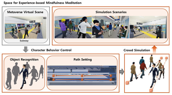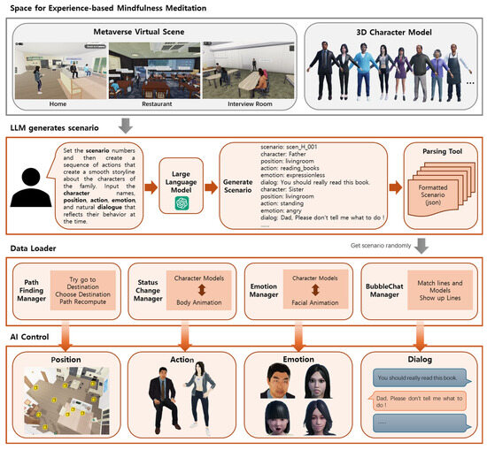 In “experience-based mindfulness meditation”, the user is prompted to select one of five distinct virtual environments. Each environment is designed to simulate common social situations using an experience-based module. Within the selected environment, users interact with AI-controlled NPCs whose behaviors and dialogues are dynamically generated by the AI control system. An LLM generates scenarios, and a management module loads scenario data to create realistic interpersonal scenarios. Then, the user is transported to the “mirror space” for inner reflection. Thereafter, the user is automatically transported back to the space they chose at the beginning.