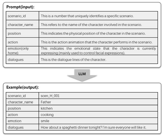 Figure 6 illustrates an example of how the scenario content was generated using LLM. A structured prompt containing key scenario elements, such as scenario ID, character name, position, action, emotion, and dialogue, is provided as input. Based on this input, the LLM generates a coherent output that specifies the detailed attributes for each element, producing contextually appropriate character behaviors and dialogues.