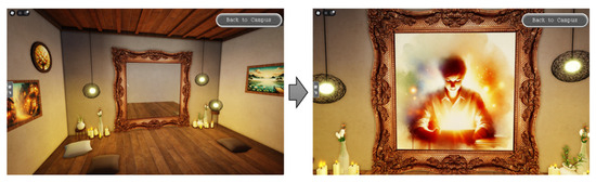 After a 3-min immersion induction experience in a dynamic social scene, users are transported to a dedicated virtual environment known as the “mirror space”. The mirror space takes the form of a tranquil wooden room or cabin. The central feature is a large, prominently displayed, ornate mirror. The overall ambiance, often enhanced by soft lighting elements such as virtual candles and hanging lamps, is curated to foster a sense of privacy and calm, which is conducive to reflection. Upon automatic teleportation from the primary interpersonal mindfulness map, the users find themselves in the focused environment. The visual of the mirror space environment is depicted in Figure 9.