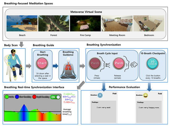 Our proposed system provides a virtual environment meticulously designed to facilitate mindfulness meditation practices through structured interactive modules. The system offers two distinct pathways for users: “experience-based mindfulness meditation” and “breathing-focused meditation”. An overview of the system is illustrated in Figure 1.