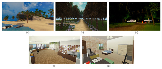 Space of breathing-focused meditation module: (a) beach; (b) forest; (c) fire camp; (d) meeting room; (e) bedroom.