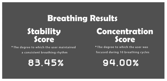 Following the initial setup steps, which include a body scan and seat selection, users engage in the breathing task through a “start” button on the screen, initiating synchronized breath input. The core of this synchronization is a purpose-built interface that delivers real-time feedback aligned with the user’s breathing rhythm. Pressing the button represents inhalation, while releasing it signifies exhalation. This direct interaction enables the system to continuously monitor the breathing process real-time. The breathing exercise begins with a guided phase, during which animated visuals of lung motion assist users in associating their bodily breathing patterns with the interface-based control. This stage also facilitates the establishment of a personalized baseline for the average breath duration. In the subsequent main breathing phase, a dynamic graph visualizes each breath relative to the calibrated baseline, making subtle fluctuations more perceptible. To support sustained attention, the module includes a simple attention-check mechanism that requires periodic user inputs during a task and serves as an indicator of engagement. Upon completion of the main breathing phase, the system presents quantitative metrics that summarized the breathing stability and attentional concentration of the user. By integrating a distraction-minimized immersive setting, interactive synchronization input, real-time visual feedback, and performance evaluation, the module directly enhances the users’ focus on their breathing and supports the development of consistent, regulated respiratory patterns. The architecture of this module is shown in Figure 11.