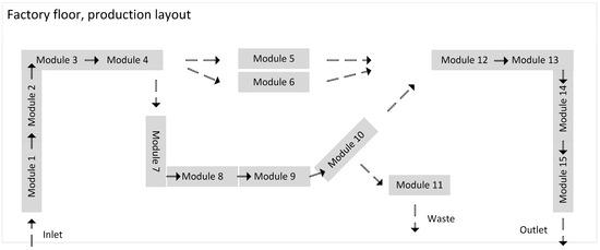 The scaling factor used in the TPS frame was 0.015, which means that one square on the grid was 0.3 × 0.3 m. From use case 1 presented in Section 3.1 and Section 3.2, the following result was achieved using the exact algorithm: using the known functionalities of the modules and technological plan for the selected product, the shortest route was selected. The combined length of the route was 23.5 m, including the length of the modules. The benchmark value was the longest route possible at 29.2 m, using only the modules with functionalities needed as specified in the technological plan.