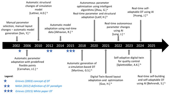 Timeline of Digital Twin (DT) development, with a focus on the self-adaptability of simulation models [5,6,15,16,17,18,19,20,21,22,23,24,25,26].