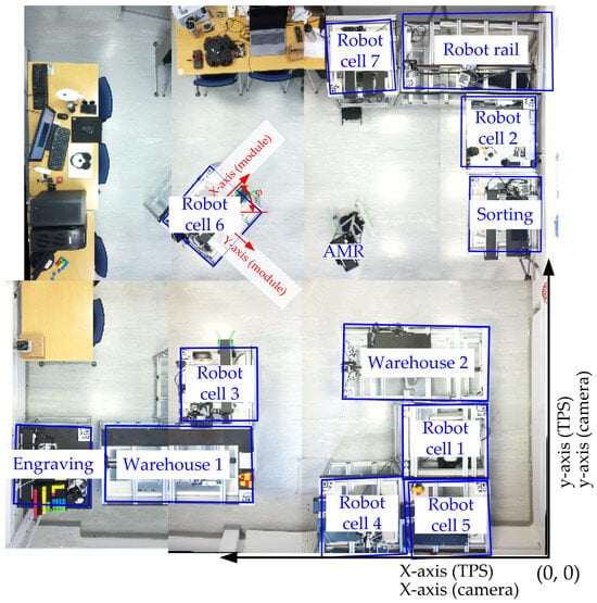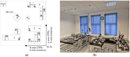 This configuration allowed for comprehensive testing of both Algorithms 1 and 2. As shown in Figure 14b, TPS effectively instantiated individual modules and correctly assembled them into production cells or lines within the virtual environment. The deviation between the placement of production modules in the real system and in TPS was within 3%, as the deviation stayed the same between the coordinates extracted by the MV system and those used in TPS; thus, the error came from the points described in Section 4.1.