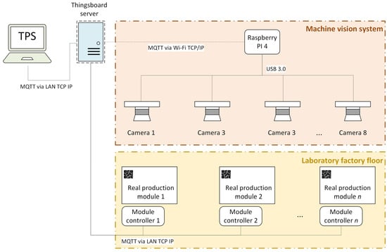 The real state of the production modules on the laboratory factory floor is recognized in real time by the Machine Vision system through the detection of QR codes placed on the modules, which defines the ID of each module, their location, orientation, and entry/exit points. Recognition of the entire laboratory factory floor requires sufficient image quality and a wide enough camera field of view to cover the area effectively; therefore, eight cameras were used for our case study. Cameras, chosen for the Machine Vision system, were equipped with a Sony IMX708 sensor (Sony Semiconductor Solutions Corp., Tokyo, Japan), as this offers a resolution of 12 MP, supports image capture up to 4608 × 2592 pixels, and features automatic focus. The camera’s field of view is 66° horizontal and 61° vertical, with enough resolution to recognize QR codes on production modules. For the synchronization of multiple cameras, a Raspberry PI 4 (Raspberry PI Ltd., Cambridge, UK) and a multi-camera board (V2.2, Arducam Technology Co., Ltd., Nanjing, China) were used.