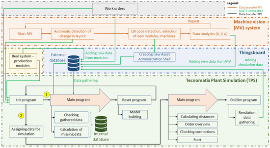 Figure 4 shows the system architecture and main subsystems and is used as the base for development of a Digital Twin framework. The main subsystems are (1) a laboratory factory floor with real production modules; (2) a Machine Vision system that consists of several cameras to cover the entire factory floor; (3) Thingsboard as an External database and a Human–Machine interface (HMI); and (4) a Tecnomatix Plant Simulation tool with an Internal database that represents the virtual environment for performing simulations of production processes. Meanwhile, Figure 5 shows detailed view of each subsystem, their inner working, the interconnections between subsystems and their roles within DT framework. Each subsystem is enclosed in dashed colored bracket and the connections between them are presented with colored arrows.