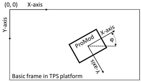 In this paper, the laboratory modular production with internal logistics is used as a case study. Building a simulation model from scratch or modifying it to replicate the real industrial layout can be a time-consuming process, which leads to the need for a self-building simulation model. With that in mind, our concept is based on modular production, where each module can be arbitrarily placed on the factory floor. Production modules can be used individually or arranged together to form a production line or production cell. In this paper, we consider production modules with the following operations: handling, assembly, warehousing, and logistics. The Plug&Produce (P&P) design is implemented to achieve the efficient interconnection of production systems in different layout configurations. Figure 3 shows one of the possible production layout configurations for our investigation. Since we have mobile production modules, we are able to create different production layouts according to the production plan and the products that have to be assembled. In Figure 3a, one of the use cases is shown, which describes individual production systems, production cells, or production lines with several interconnected modules. The arrows on modules showcase possible moving direction of products in/out of modules. Figure 3b shows a photo of the physical testbed, a real laboratory environment showing modular production systems placed on the laboratory floor and a Machine Vision system located on the laboratory roof. To characterize the modules’ existence on the laboratory factory floor, at least their location (X, Y), orientation (φ), and the module type (QR codes) should be recognized. For this purpose, we used a Machine Vision (MV) system, which is described in more detail later (see Section 3.3). The camera view has its own coordinate system and is synchronized with the coordinate system of Tecnomatix Plant Simulation (TPS).