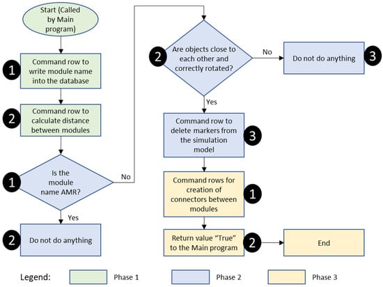 - The specifics of certain production modules, such as the Warehouse module, were properly considered and implemented. The Warehouse module has entry and exit points in the same location; thus, the placement of other production modules next to the Warehouse module and the Warehouse module’s rotation had to be considered. For instance, if the entry point into the Warehouse module was on its left side and there was a different production module on its right side, the algorithm correctly recognized this fact; it did not connect both production modules due to misalignment between the entry and exit points of the production modules.