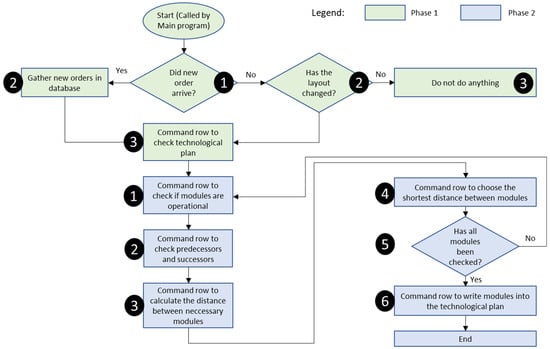 The principle for the material flow optimization algorithm is based on work orders and the technological plan of products. Based on the gathered technological plan of the products, which specifies what operations are needed for the creation of a specified product (based on the known functionality of modules), the algorithm optimizes the material flow.