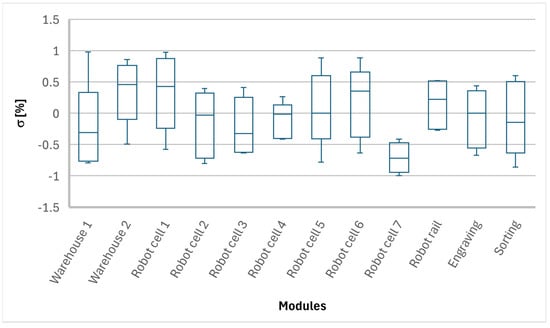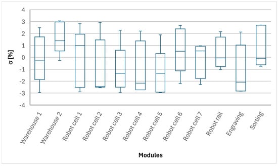 Table 3 outlines the special attributes of each module, providing the additional data necessary for the comprehensive “inventory” and proper characterization of each module. Not all of the data presented in Table 2 and Table 3 is currently used for simulation, as all of the modules were treated as “black boxes”; however, all the prepared and monitored data can be used for the future expansion of the modules, where each elementary operation will be simulated. Based on our research questions, we defined the initial potential data and attributes needed for the self-building of simulation models by marking these with *, and the data and attributes needed for running the simulation model were marked with **. The special attributes listed in Table 3 (from 1 to 5) were gathered from real-world modules and subsequently stored in a database for further utilization. All monitored and recorded data was systematically prepared for future module expansions and for developing the Asset Administrative Shells (AASs), as well as the final DT of a given production process. These expansions aim to simulate, monitor, and analyze each module’s elementary operations in detail.